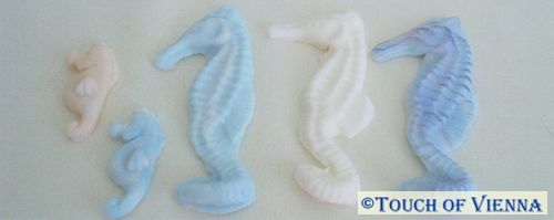 Cake ornaments are hand-molded from edible sugar paste. Sea shell cake ornaments were available in assortments of 75, 50 and 25 shell sets.