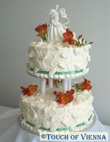 8 -10 inch round; makes 75 servings. (1"x 2 "pieces, 4" high) Very elegant two-tier wedding cake is vanilla flavored and filled with European butter-cream icing and custard. This cake is covered with off-white butter-cream icing and the sides of each tier are then decorated with white icing vines and leaves which are hand-molded from sugar paste. Willow green ribbon is added to coordinate with bridal theme. Beautiful fresh fuchsia flowers are adding to the final touches. Cake top - commercial Bianca tops this elegant wedding cake. |