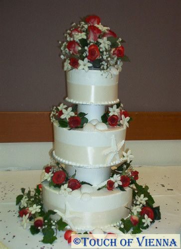This elegant multi-tiered chocolate, lemon and vanilla wedding cake is filled with lemon, vanilla and chocolate/rum European butter-cream icing. It is covered with off-white butter-cream icing and decorated with red and peach roses, stephanotis and baby's breath. Beige ribbon, white Starfish and Sea shells coordinate with bridal theme. |