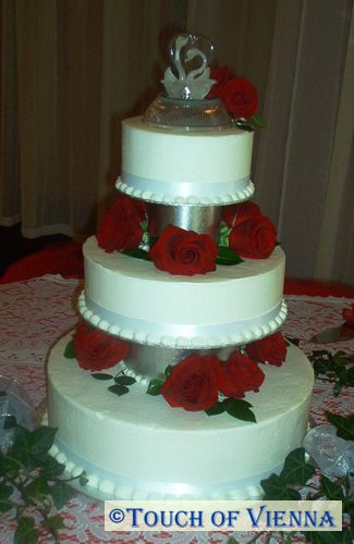 butter-cream icing. The cake is finished with white satin ribbon A ruby-red roses and swan cake topper adds to the beauty of this simple and elegant wedding cake. |