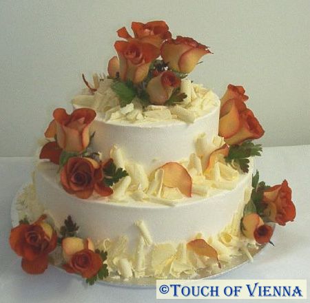 8”- 12” round; makes 76 servings (2”x 1 ½” pieces, 3” high) This beautiful, modern wedding cake is made from lemon pound cake filled and iced with white butter-cream icing and decorated with white chocolate curls. Fresh roses called Leonidas and it’s petals added to the beauty of this cake. |