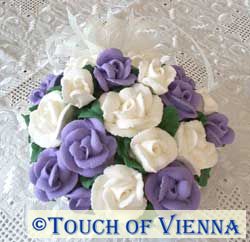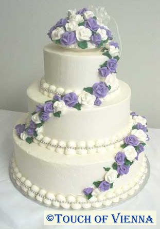 6"-9"-12" round; makes 114 servings. (1"x 2" pieces, 4" high) This simple and elegant three-tier French vanilla flavored cake is filled with European butter-cream icing and custard. The cake is covered with soft butter-cream icing and decorated with mauve and white roses and buds cascading down from the top tier. The silver beads add the final touches to the cake. The cake top is a cluster of mauve and white roses made from royal icing |