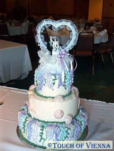 curd and European butter-cram icing. The cake is iced with white butter-cream icing and decorated with icing wisteria flowers and sugar-paste seashells. The cake topper “Just Married” is made at our shop. |