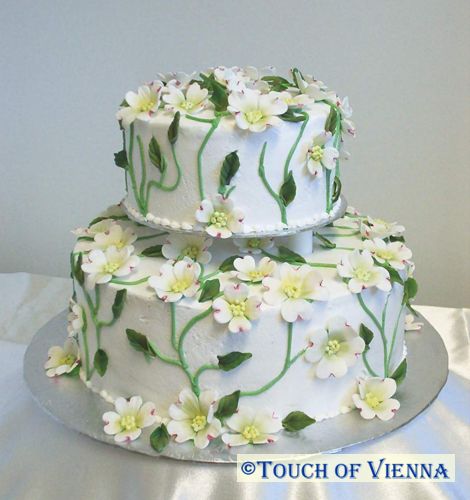 mocha sponge cake and filled with espresso mousse. The cake is iced with European butter-cream icing and decorated with wines and Dogwood flowers and leaves that are hand molded from sugar-paste. |