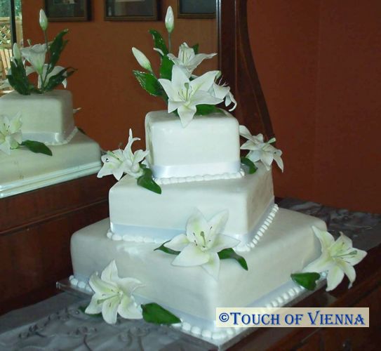 filled with vanilla butter-cram icing and vanilla custard. It is covered with rolled Australian icing and decorated with hand molded Sugar-paste white lilies. |